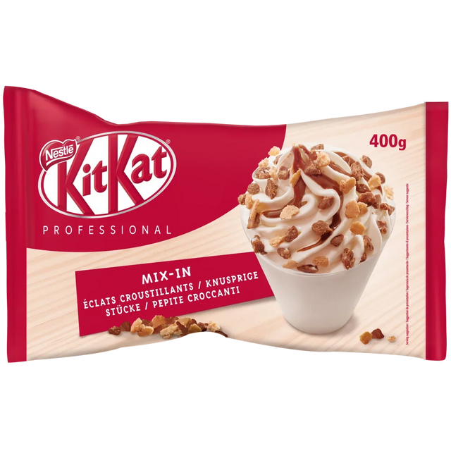 KITKAT® Mix-In brings the signature crispy wafer and smooth milk chocolate of KITKAT® in a convenient, dessert-ready format. These crunchy, chocolate-coated wafer pieces add texture and flavour to a wide range of sweet treats, from cakes and pastries to doughnuts and ice cream.