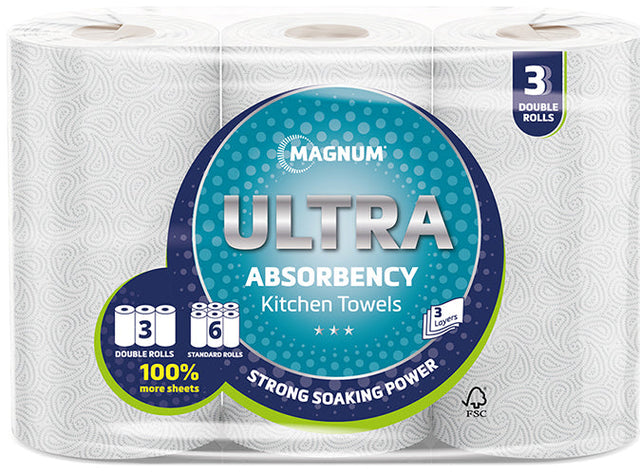 Introducing Magnum Ultra Double Kitchen Towel! This pack of 3 rolls (equivalent to 6 regular rolls) offers ultra absorbency for efficient cleaning and spill removal. With 3 ply thickness, these rolls are perfect for all your kitchen needs. Upgrade your cleaning game with Magnum!