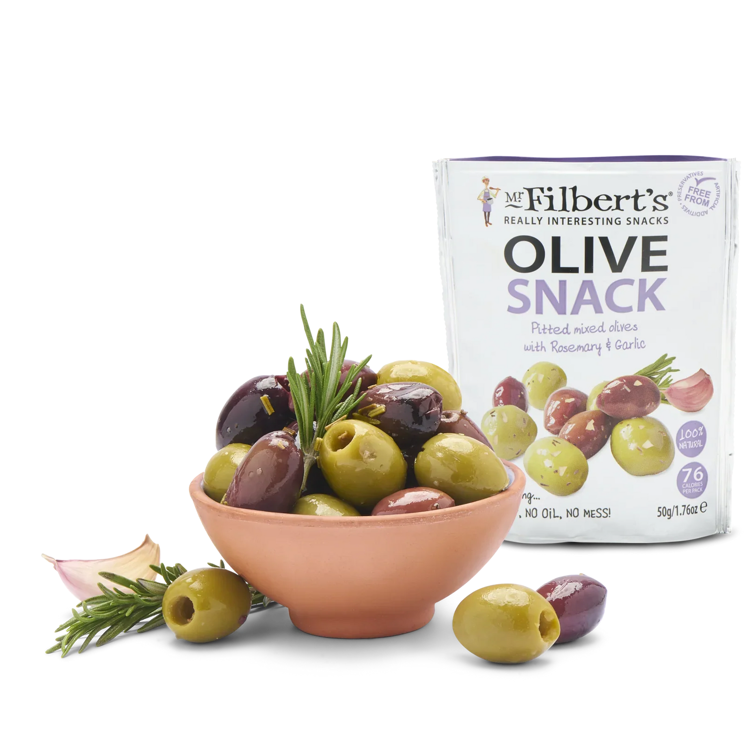 Mr Filbert's Rosemary & Garlic Mixed Olives – 50g (Box of 12)